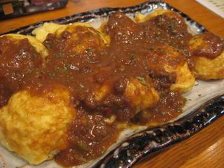 その中の一つ「インドのたこ焼き(インド人もびっくり)」を注文。たこ焼きにカレーというメニューはあちこちで見かけるようになりましたが、明石焼にカレーは初めて。オムレツにカレーがかかっているような感じです。