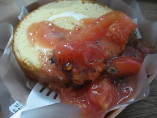 美味しいロールケーキに酸味の強いトマトソース。クセになりそうな組み合わせです。ロールケーキは、奈良にある有名なお店のものなんですね。
