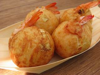 特注の鉄板で焼きあげたえび焼き。半分にはえび、半分にはきゃべつを入れ鉄板をあわせて焼き上げています。生地にもしっかり味がついていていい感じです。