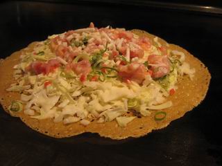 焼き上がりを見ると一銭洋食風なのですが、具を載せたところだと写真のような感じでなるほどかしみんです。