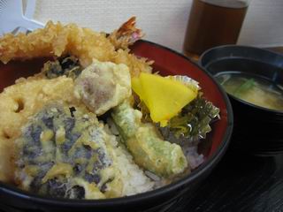 少し期待をしながら待つことしばらく。出てきた天丼は写真のようにかなりのボリューム。えび、なす、梅干、レンコン、ししとうなどの天ぷらが所狭しとのっています。あげたてのサクサク感もいい感じ。タレもそれほど濃い味でなく、天ぷらやご飯とよくあっていておいしいです。