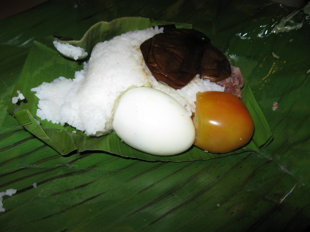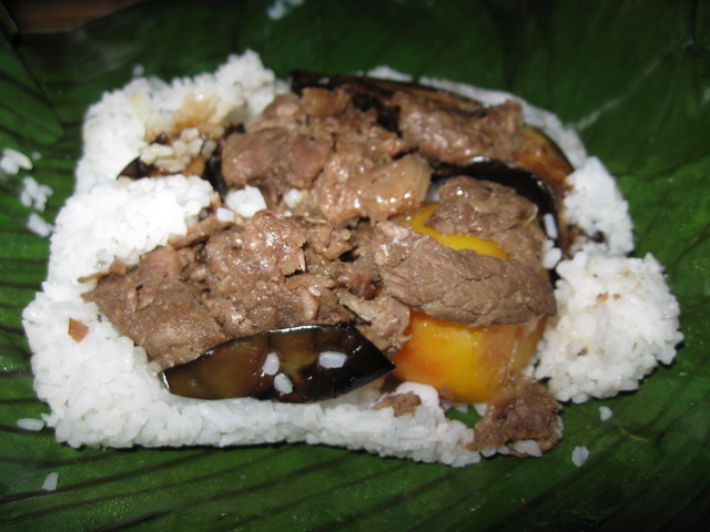 この料理はトシーノ。豚肉を甘く煮てあります。写真ではナスの下側にあるのがそのトシーノです。この料理がフィリピンでのお袋の味にあたる料理だということも知りました。