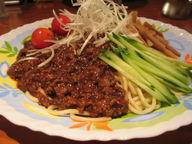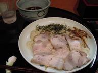 まず、器がでかい!30センチぐらいある器に盛られて出てきました。魚介系塩味のスープに細めんが程よい絡み具合で美味しい。上にのっている泉州のアオリイカ+山芋に自家製のピリ辛のタレも夏にはぴったり。