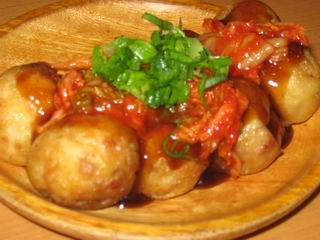 蛸浩さんには創作たこ焼きがいくつもあるのですが、カレーをかけたり、キムチをのせたりといった一工夫がユニークです。キムチの辛さとたこ焼きの味とがあって、おいしいたこ焼きです。
