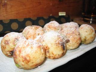 そしてチョコ焼き。もともと甲州ワインの周五郎という甘口ワインに合わせるために作ったものだそうです。中にはアーモンドチョコ。これが融けすぎて生地にチョコが行かないものをずいぶん研究したそうです。上に乗せたアイスが程よくとけて甘いミルク味と一緒になり、クレープともまた違う面白い、おいしいたこ焼き?でした。