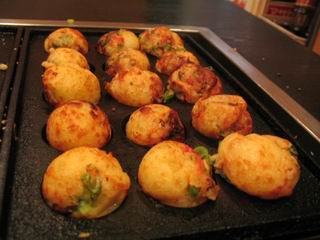 お店の名前と同じ「蛸のつぼ焼き」をお願いしました。一列ずつ中味が蛸・肉・海老になっています。そのままでもだし味でいい感じなのですが、中味によってソースや酢しょうゆなどを使い分けて食べられるのさらにおいしくして食べました。