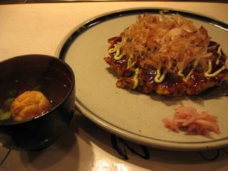 お好み焼きを注文すると、たこ焼き入りのお吸い物が付いてきました。ちょっと得した気分です。