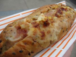 ゴマのバンズにソーセージとチーズ(カルボナーラ)がたっぷり。値段は500円しますが、チーズの香りもして、おいしかったです。