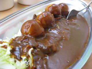 早速たこ焼きカレーを注文。ずっと気になっていたのはカレー店のたこ焼き。そのためにたこ焼きを焼くということが考えられないですからね。ここでは冷凍モノのたこ焼きを揚げたものがカレーに乗っかっていました。なるほどこれなら、カレーがおいしい上にたこ焼きも楽しむことができますね。