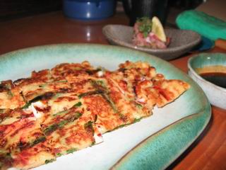 椅子に座るとまず付け出し(写真奥)。これが蛸に梅おろしという組み合わせで美味しい。期待感が徐々に高まっていきます。次にやはり粉もんの「たこチヂミ」。にらとにんじんがいっぱいでその中に蛸。これを韓国風のたれにつけて食べるといい感じです。