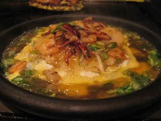 お店に入ってから気になって仕方がなかったのが、あんかけご飯。お好み焼状に鉄板で焼いたご飯の上にいかやお肉、ホタテなどが乗って、あんかけに。香ばしいご飯と和風だしのあんの組み合わせは、絶妙です。半分のサイズにしてもらったのですが、それでも十分過ぎる大きさでした。