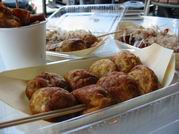 最後は、「ごめんね焼」。たこ焼き4個を玉子とチーズをいか焼き機でオムレツ状に焼いたもの。たこ焼きがまん丸からつぶされるので「ゴメンね」と呟いたのが名前のきっかけとか。2年程前に作られたこのメニューは人気商品となっているそうです。チーズがとろりと丸い味に仕上げておいしかったです。