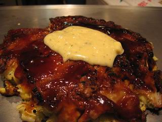 ここのお好み焼きは、外がちょうどいい具合にサクサクしている上に豚肉の旨味が生地にしっかりでています。その上、特製のタルタルソース+選べる地ソースがかかり、まるでハンバーグか何かを食べているような感じさえします。特製タルタルは某マヨネーズメーカーが作り方を聞きにきたという逸品。