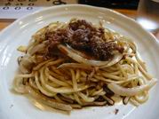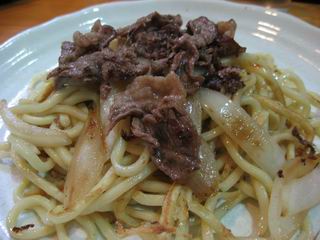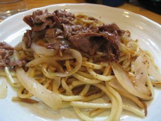 肉たまねぎは麺と別に炒めて乗せてあるだけで、好きな味付けになるようにテーブルのソースをかけて食べるようになっています。肉やたまねぎと麺の量のバランスがよく、美味しいです。