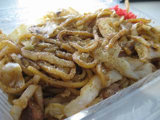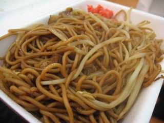 まずは焼きそばを二つ。一つは富士宮焼きそば。もう一つは「トミーズのはらぺこキッチン極」ブースの幻の焼きそば。蒸し麺を使った富士宮の焼きそばはコシがあっていつ食べてもおいしいです。幻の焼きそばは、会場限定で広東麺をソースで炒めています。こちらもコシがあっておいしかったです。