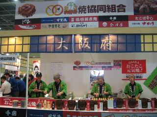 大阪のコナモンといえば、お好み焼とたこ焼き。6号館の大阪府のブースでお好み焼たこ焼き協同組合のお店の方々が出店しています。食博会場のたこ焼きの中でここが一番おいしかったです。10店舗のソースが置いてあって自由に選べるのもうれしいです。たこ焼きは「くくる」の味と焼き方。だから、くくるのたこ焼き+会津屋のしょうゆとか、くくるのたこ焼き+甲賀流のソースなど、普段では考えられない組み合わせを食べるというちょっとマニアックな楽しみ方ができます。