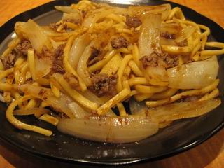 牛肉とたまねぎを使った今里やきそばを再現して販売されています。そのまま食べてもいいぐらいに味付けがされていますが、テーブルのソースでさらに好みの味にすることもできます。たまねぎや肉が多く入っているのでその旨味や甘みがしっかり出ていていい感じでした。
